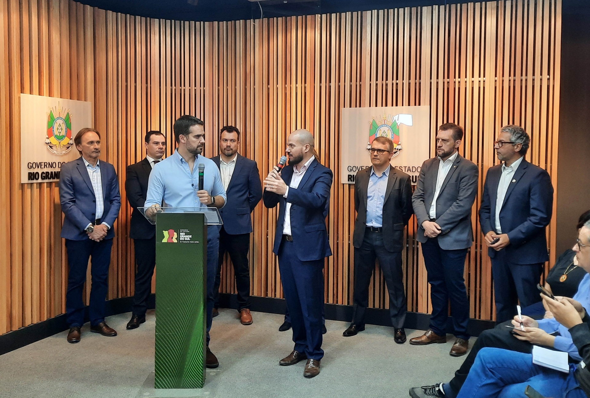 Legenda: Anúncio do novo sistema free flow ocorreu nesta quinta (17), no Palácio do Piratini, com a presença do governador do Estado, Eduardo Leite, e de representantes da CSG.