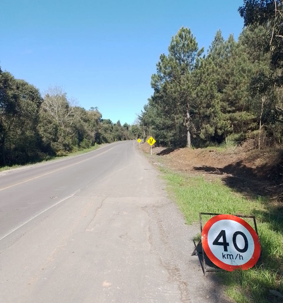 Legenda: Até o fim de novembro, por conta de estreitamentos da pista, a RSC-453 estará sinalizada e o fluxo do trânsito poderá ser alterado na rodovia para o sistema “pare e siga”.