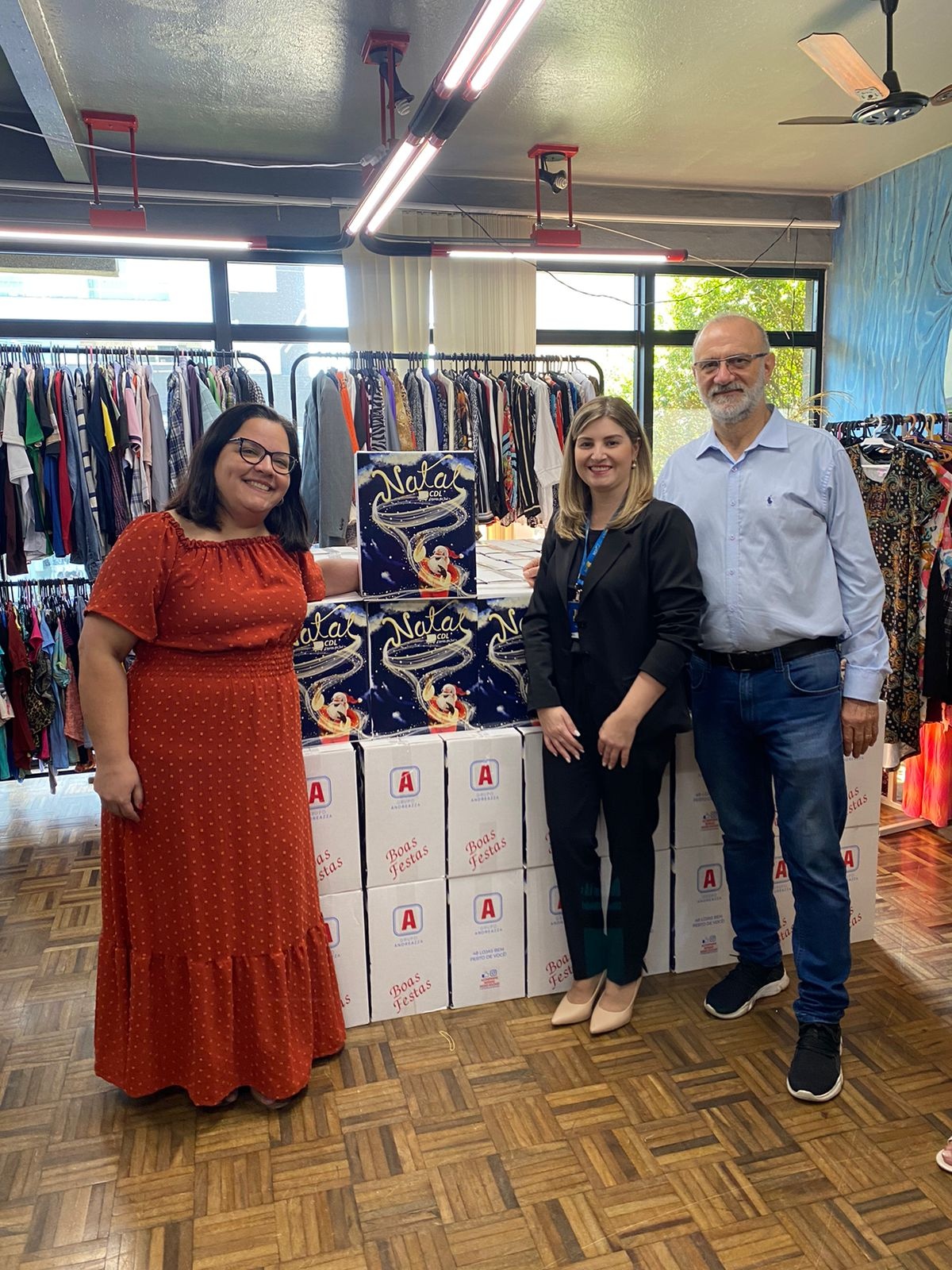 Legenda: Aline Saraiva, coordenadora de Projetos da Apadev, recebeu as cestas de Vivian Gomes, Instrutora de Aprendizagem da CDL Caxias, e de Gelso Furlin, 2º vice-presidente da CDL Caxias