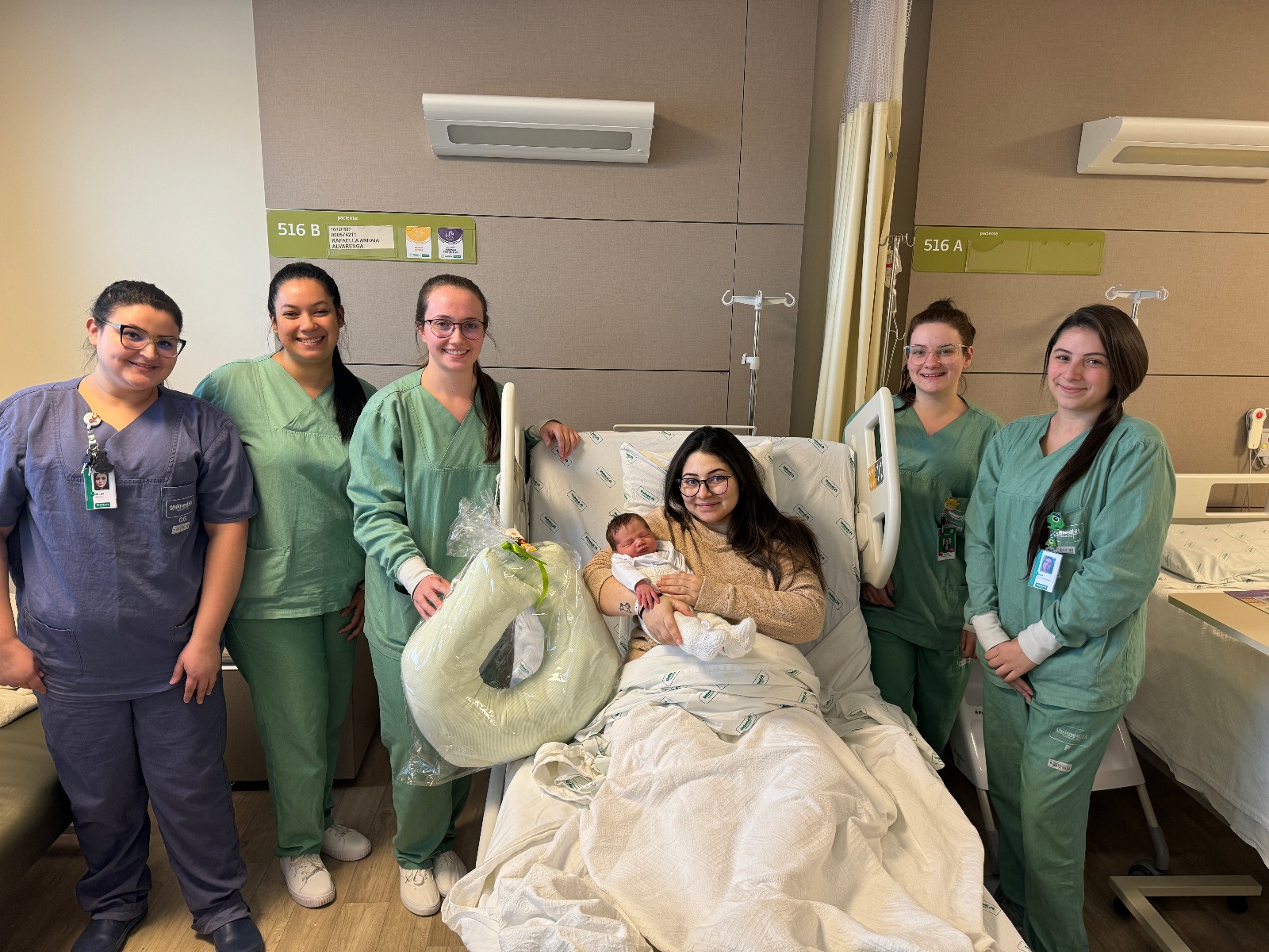 Legenda :Rafaella Anhaia Alvarenga, com o filho, Matias Spinelli, foram os primeiros homenageados em agosto. A entrega foi realizada pelas profissionais da Unidade Materno-Infantil da Unimed Nordeste-RS: a enfermeira Cristiane dos Santos Maziero e as técnicas de enfermagem Mariana Talyta Pedrotti, Itatiaia Pasqualetti Loss, Suelen Rosi da Rocha e Keisy Rafaela Almeida dos Santos.