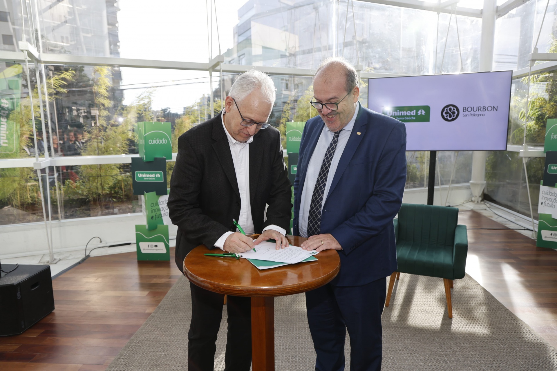 Legenda 1: Dr. André Leite, presidente da Unimed Serra Gaúcha, e Claudio Luiz Zaffari, diretor do Grupo Zaffari, durante a assinatura da parceria da nova central de serviços da Unimed no Bourbon Shopping San Pellegrino.