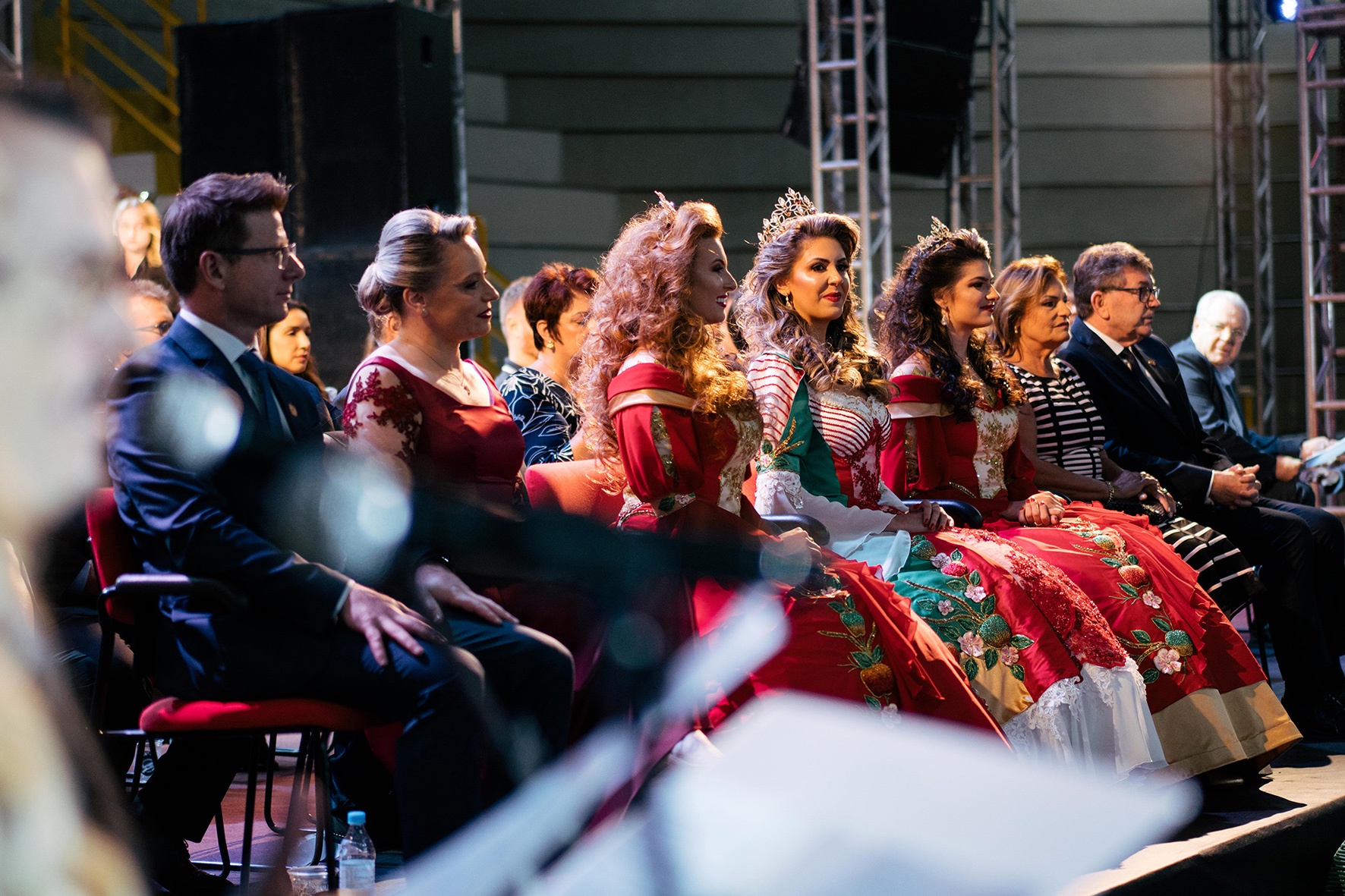 As soberanas da XI Femaçã, a imperatriz Taís Munaretti e as princesas Gisele Rebelatto da Fonseca e Angélica Verruck, também deram as boas-vindas e compartilharam com o público a emoção que é representar o principal evento do município. O trio vestia o novo traje oficial, em estilo greco-romano, confeccionado por Anita e Letíca Cenci.
